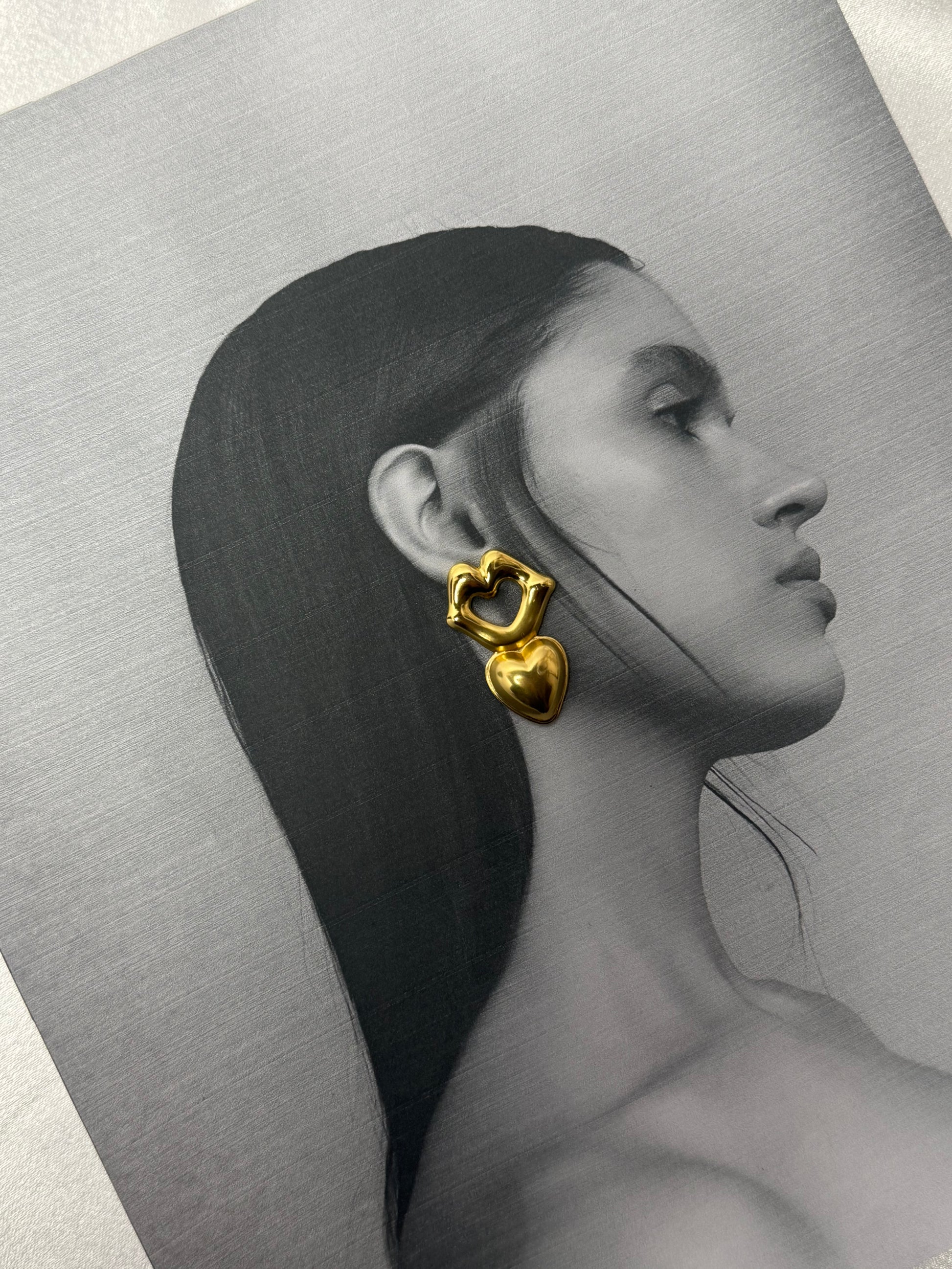 Elevate your jewelry stack with these double heart drop earrings, designed for those who prioritize both aesthetic and endurance. Featuring a hollow top heart linked to a solid polished puff heart, these dangles offer a bold vintage look with a modern minimalist edge.