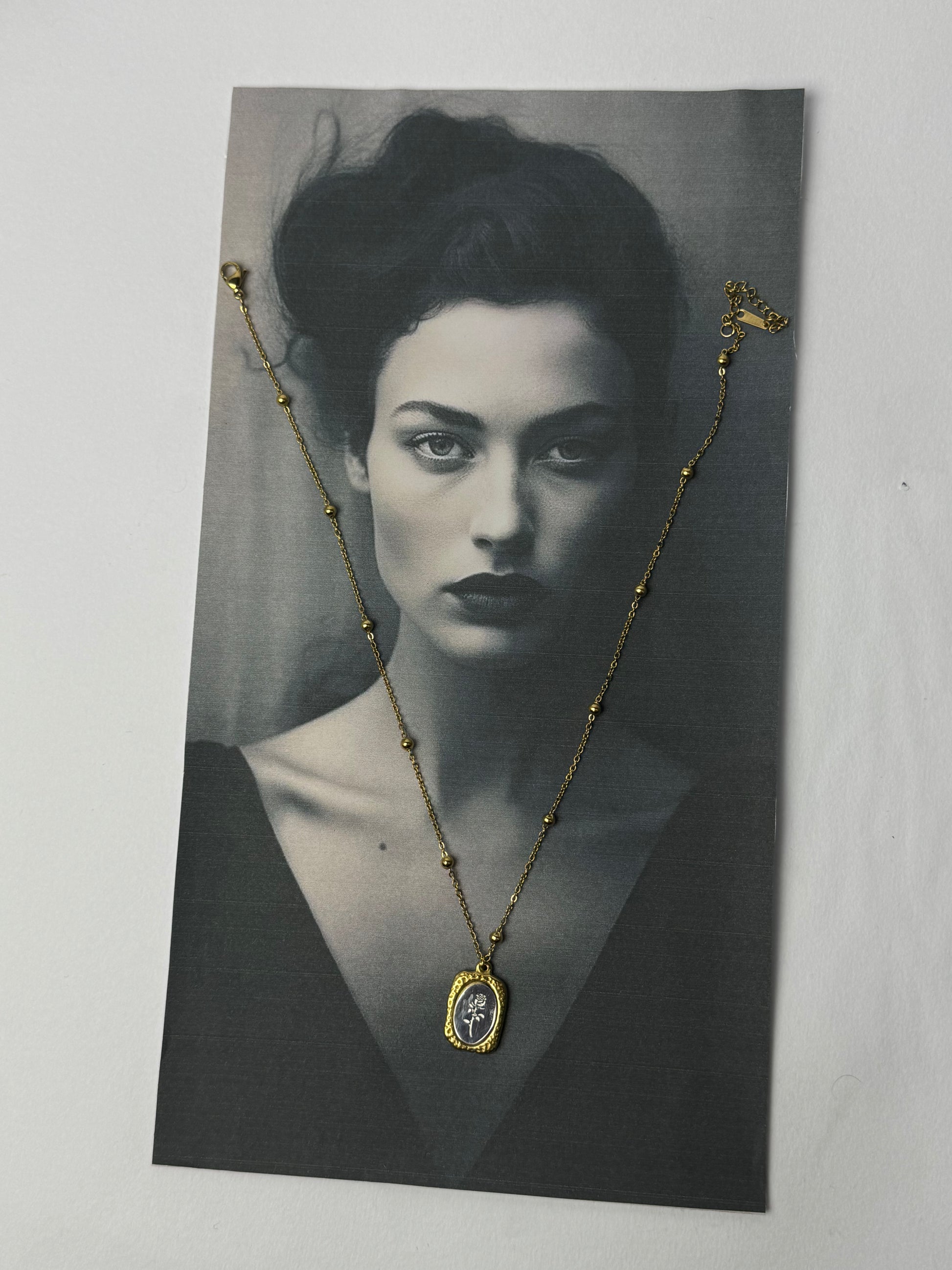 • Design: Vintage rose pendant on a beaded satellite chain.