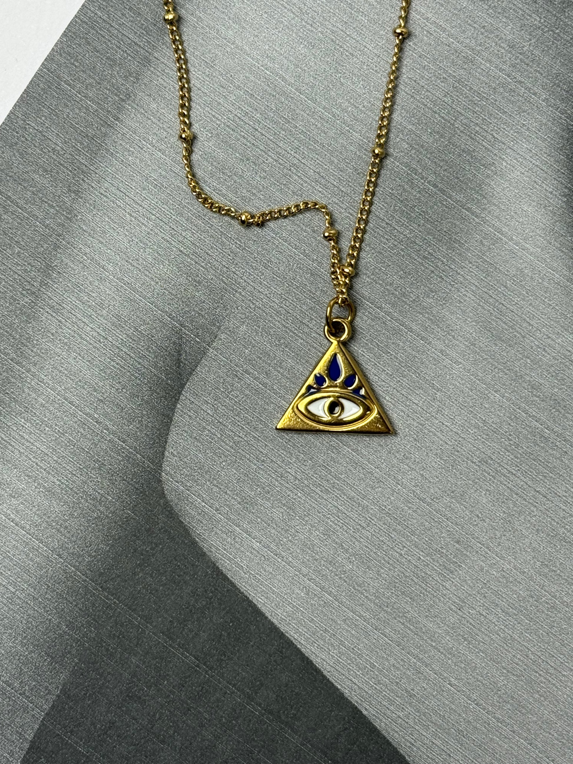 Protect your peace with the Evil Eye Triangle Necklace. This 304 stainless steel piece features a 18K gold plated finish and a dainty satellite chain for a textured, curated look. It is fully water-resistant and hypoallergenic, meaning you can wear your protection 24/7 without the itch or the tarnish.