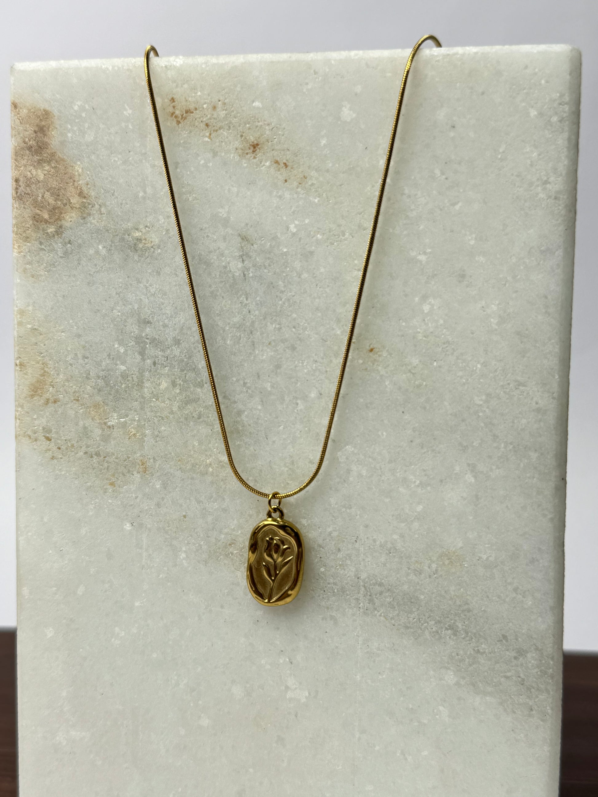 • Design: Embossed tulip pendant on a flexible snake chain.