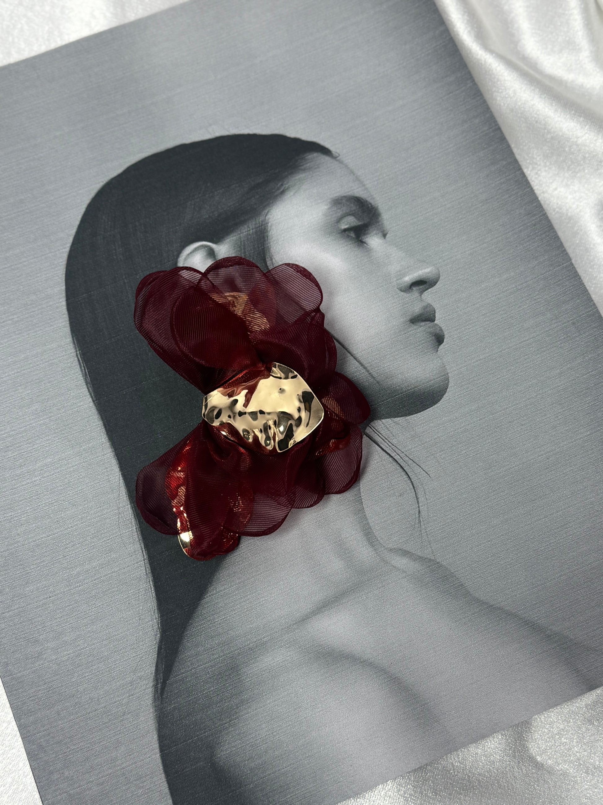 Surrounding the golden center are voluminous layers of ethereal burgundy organza, meticulously ruffled to mimic the look of a blooming winter rose. The sheer, airy fabric catches the light with every movement, creating a soft silhouette that beautifully frames the face.