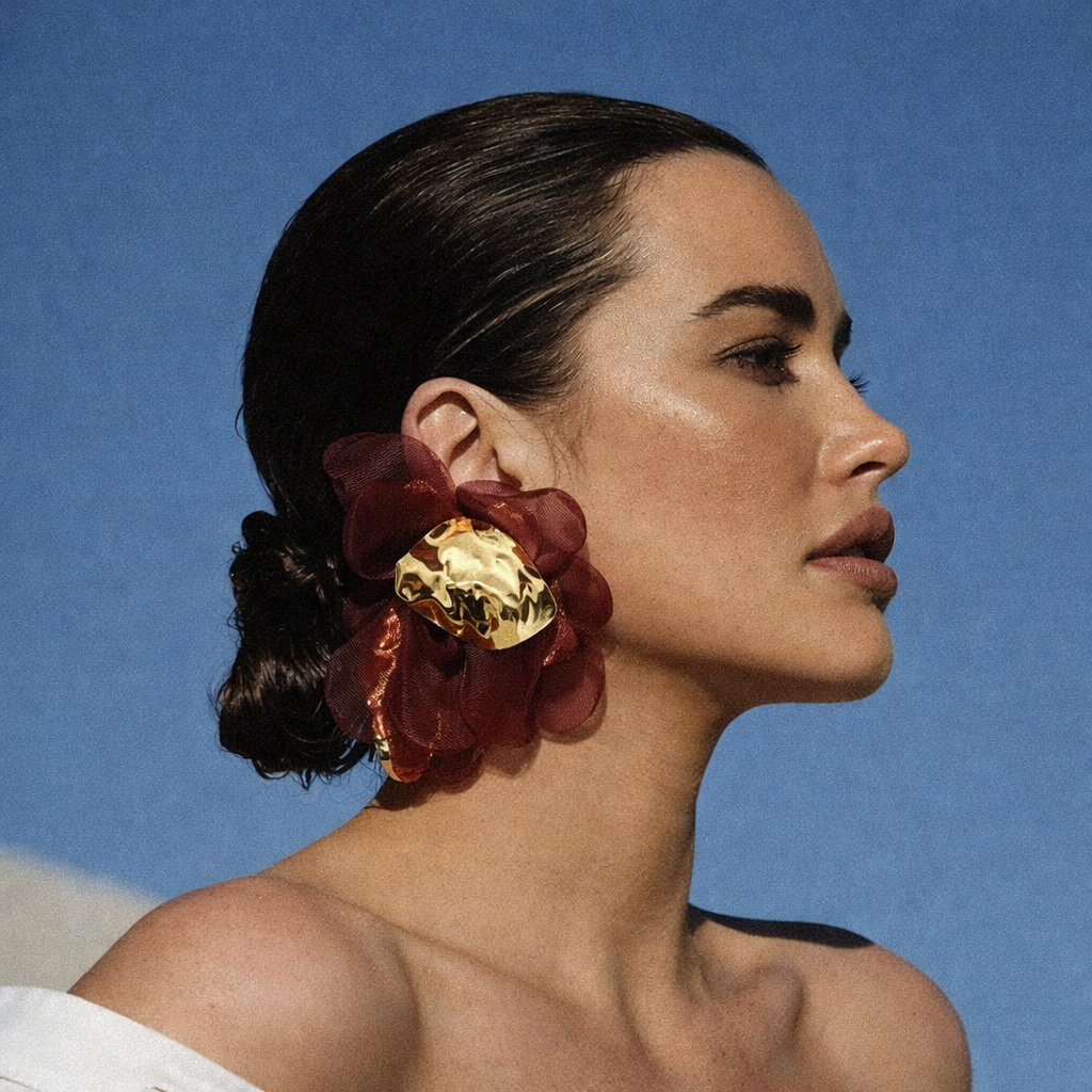 Let these earrings take center stage by styling your hair in a sleek low bun or a polished back-sweep, as seen in the lookbook. Pair them with a neutral-toned dress or a sharp blazer to let the deep burgundy and gold tones pop.