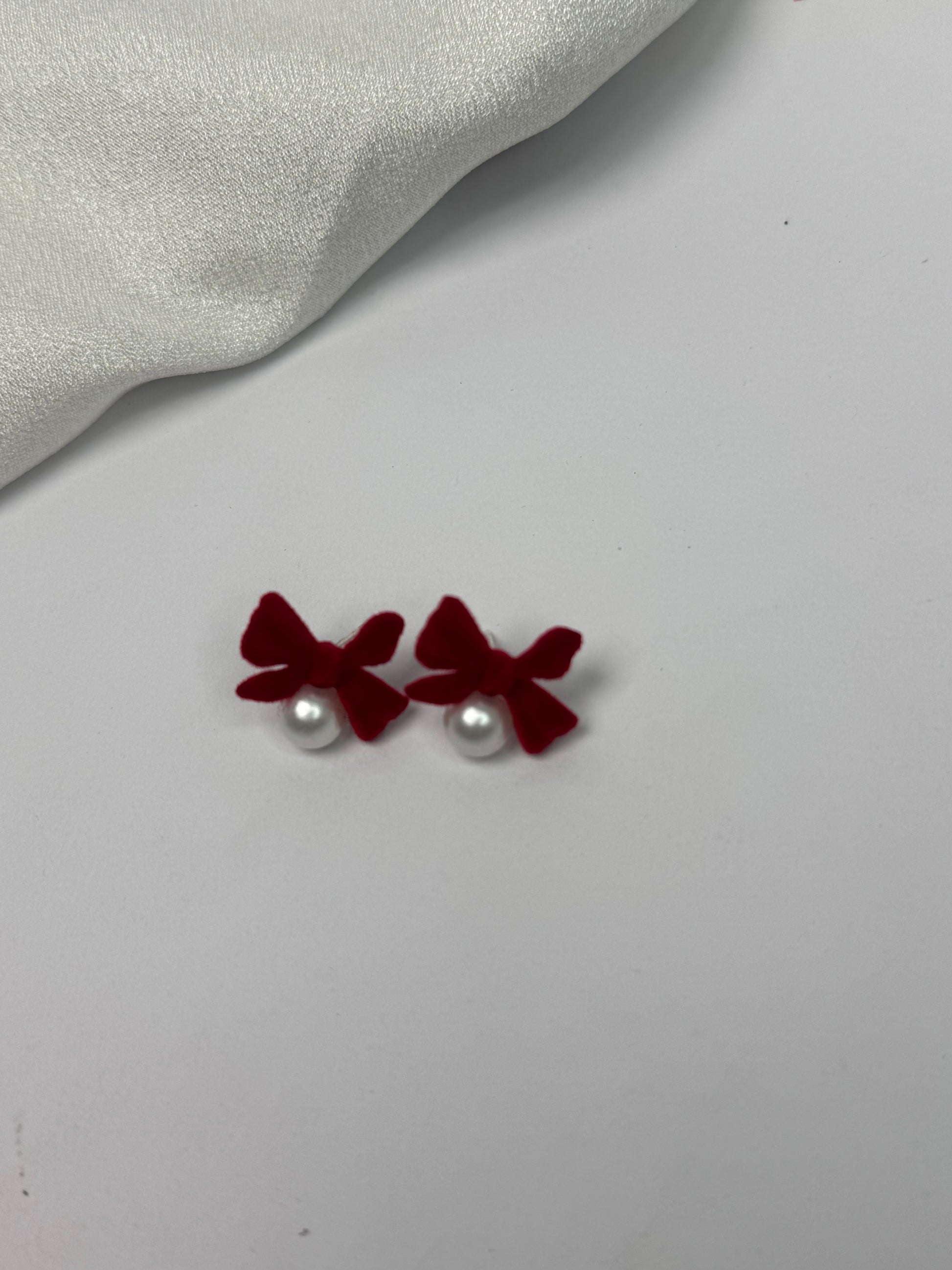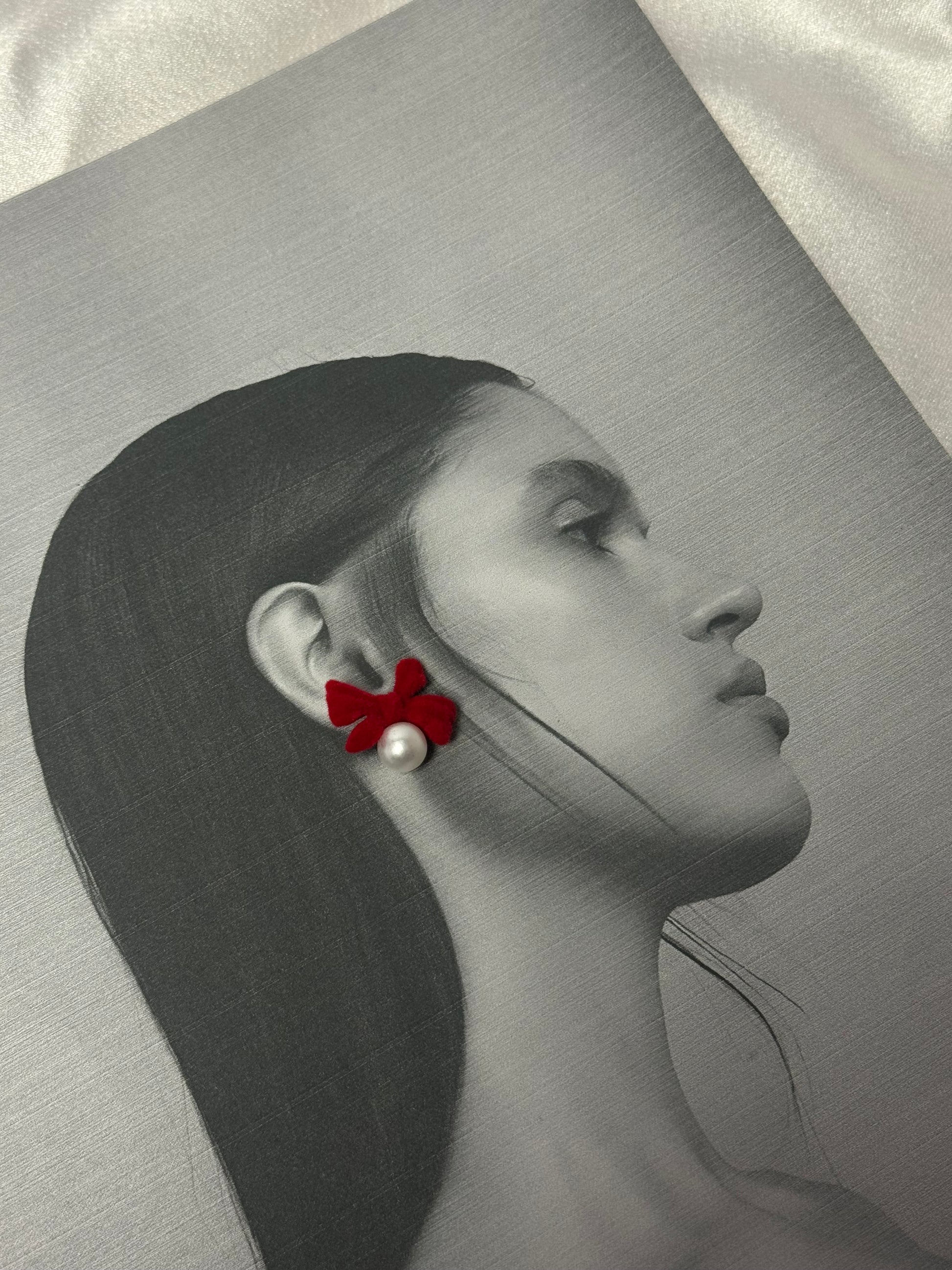Designed in Korea, these adorable studs perfectly capture the "Coquette" and "Balletcore" trends currently sweeping through Seoul's fashion scene. Each earring features a meticulously crafted crimson red velvet bow, offering a rich, tactile texture that feels both vintage and modern. Suspended just below the knot is a single, shimmering faux pearl, adding a touch of classic Korean elegance to the playful silhouette.