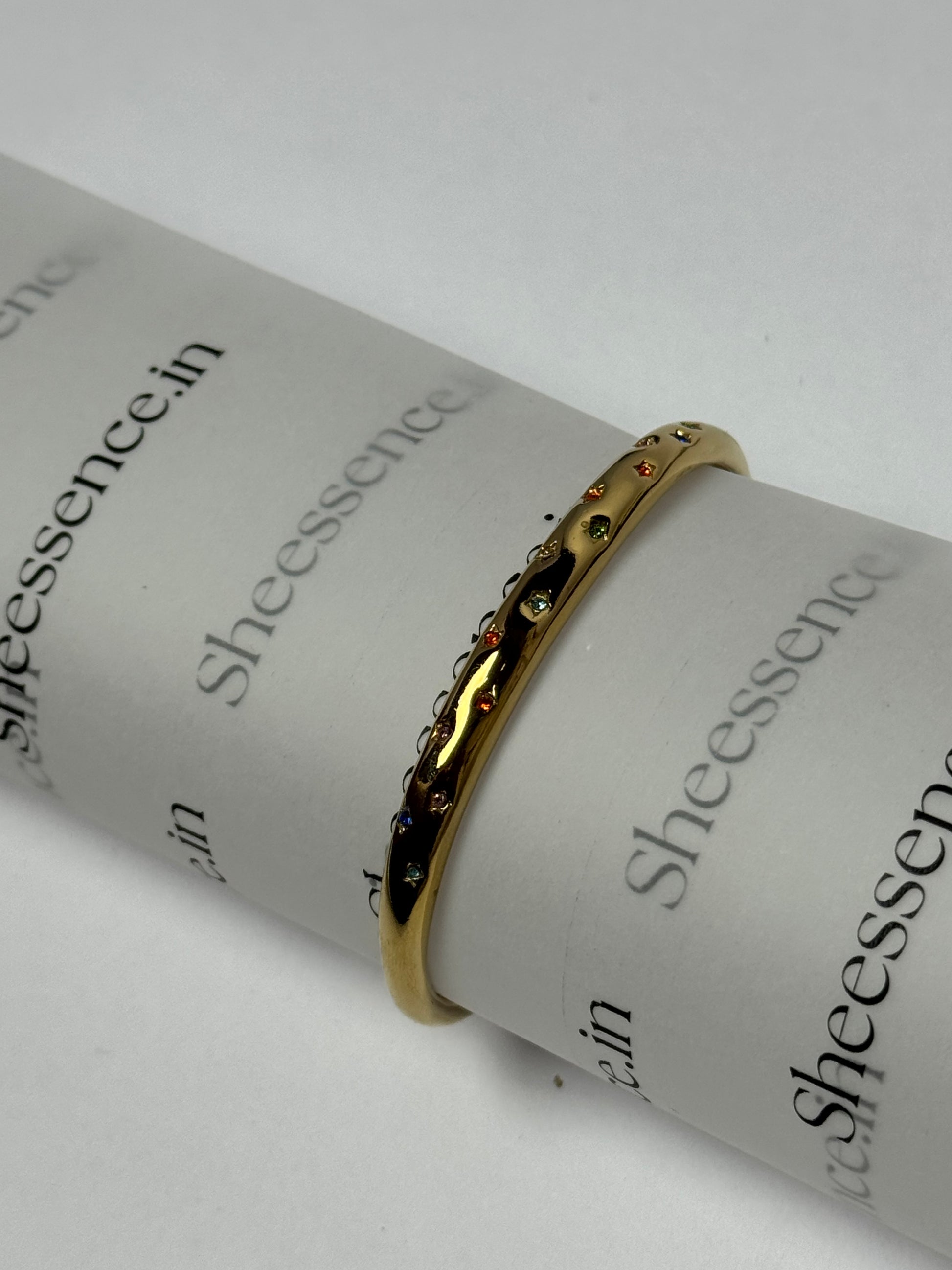 A sleek, high-shine kada bracelet designed to elevate everyday style. Crafted in premium stainless steel with 18k gold plating, this bracelet offers a luxe finish with long-lasting durability. The sleek kada silhouette is accented with sparkling stones that give a subtle diamond-inspired shine without being loud. Lightweight, anti-tarnish, skin-friendly and waterproof, made to wear daily or style for occasions.